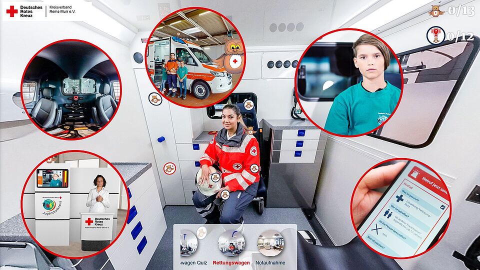 Um dieses besondere Erlebnis dennoch zu ermöglichen, entwickelt das DRK Rems-Murr derzeit ein innovatives digitales Angebot: „Die Rotkreuz-Eule im magischen Rettungswagen“. In einer kindgerechten 3D-Umgebung können Kinder einen Rettungswagen virtuell entdecken, Blaulicht, Ausrüstung und Einsatzkräfte kennenlernen und über Texte, Fotos, Videos und Quiz-Elemente spielerisch lernen. Avatare von echten Helferinnen und Helfern geben dabei spannende Einblicke in ihren Alltag.