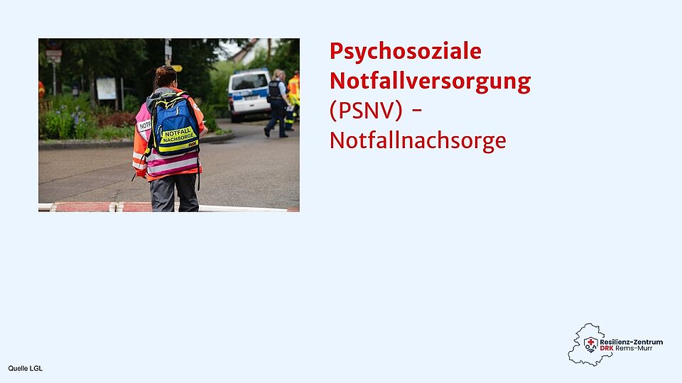 Die Maßnahmen der psychosozialen Notfallversorgung zielen auf die Bewältigung von kritischenLebensereignissen und der damit einhergehenden Belastungen für Betroffene einerseits und für Einsatzkräfte andererseits ab. Um die Qualität nach einheitlichen Standards sicherstellen zu können, sind Ziele, Aufgaben, Einsatzindikationen, Maßnahmen,- sowie Anforderungen und Ausbildungscurricula im DRK-Rahmenkonzept PSNV beschrieben. Beim DRK-Kreisverband Rems Murr engagieren sich aktuell rund 20 Menschen in diesem ehrenamtlichen Dienst.
